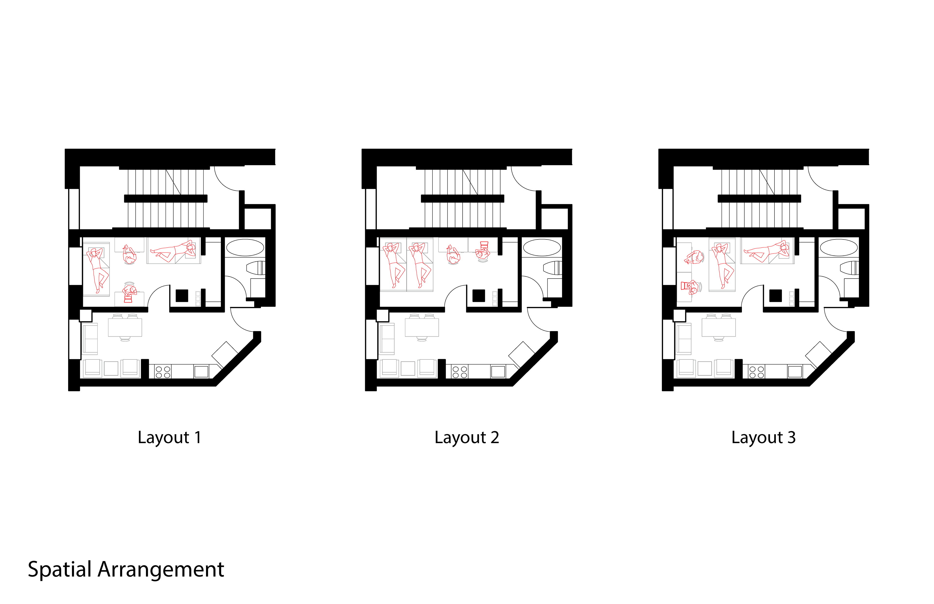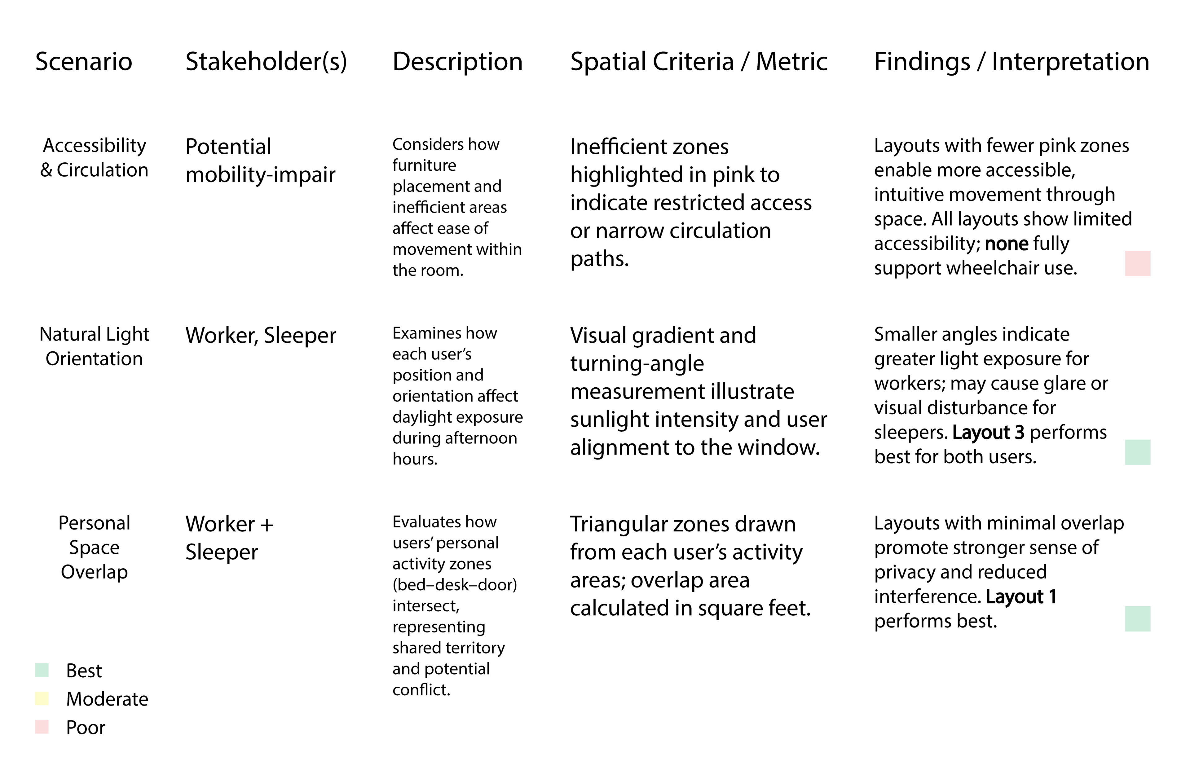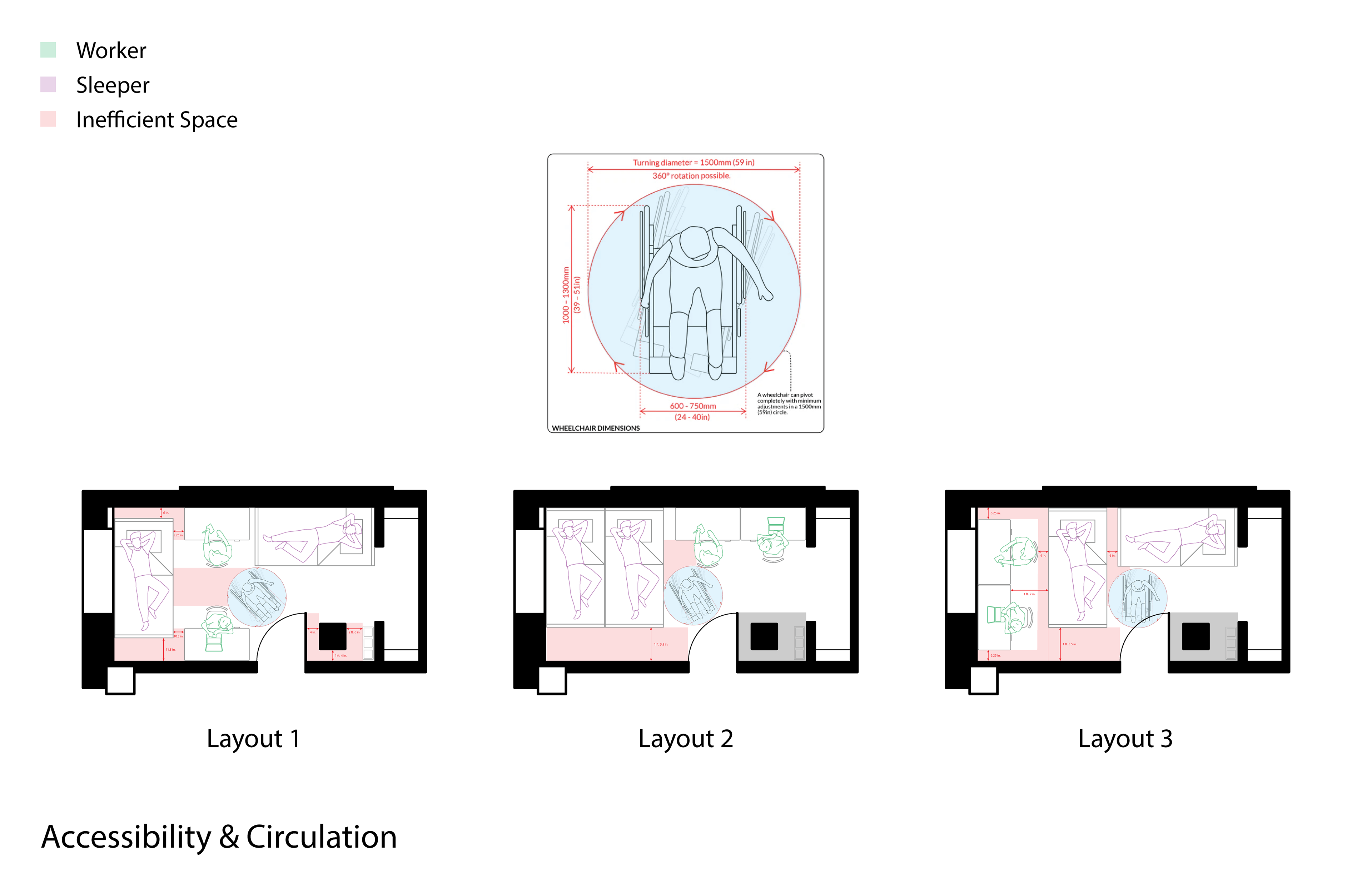 This work examines architectural representation as a tool for analyzing user behavior, spatial needs, and environmental performance through functional scenarios, behavioral mapping, and health-centered evaluation. The projects apply these methods to a public-space pavilion redesign informed by observed use patterns and to a residential layout study comparing accessibility, daylight orientation, and personal space overlap, demonstrating how observation and data translate into clear spatial interventions.